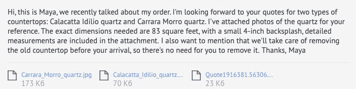We understand that contractors may change their behavior or provide specially curated responses when they know they’re being evaluated for a ranking site. The mystery shopper method helps us avoid this since companies don’t know they’re interacting with a researcher. We become regular customers, just like anyone looking to order a countertop for their kitchen. This eliminates bias and allows us to obtain authentic data about the company’s performance.